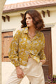 This crop shirt features balloon elasticized full sleeves and a button-down design, offering both comfort and versatility. With its hand block printed pattern with organic colours, it adds a unique and artistic touch to your ensemble.