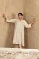 Crafted in a soft neutral tone, the beige Sukoon dress features subtle light grey eco-friendly handblock print that add a quiet charm. The below-the-knee silhouette is complemented by a front button-down opening, offering ease and structure. Thoughtful design details like the relaxed fit and 3/4th sleeves with slit cuffs lend both comfort and a hint of sophistication. Perfect for slow days that call for calm, breathable style.