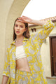 The set includes a button down shirt with full sleeves, paired with matching shorts. Perfect for resort wear, this ensemble exudes a soothing and natural vibe.
